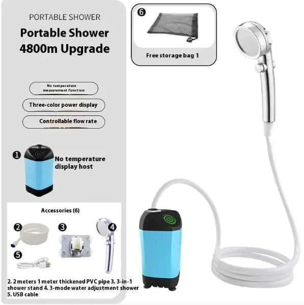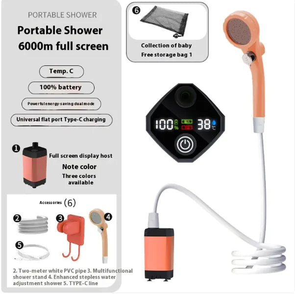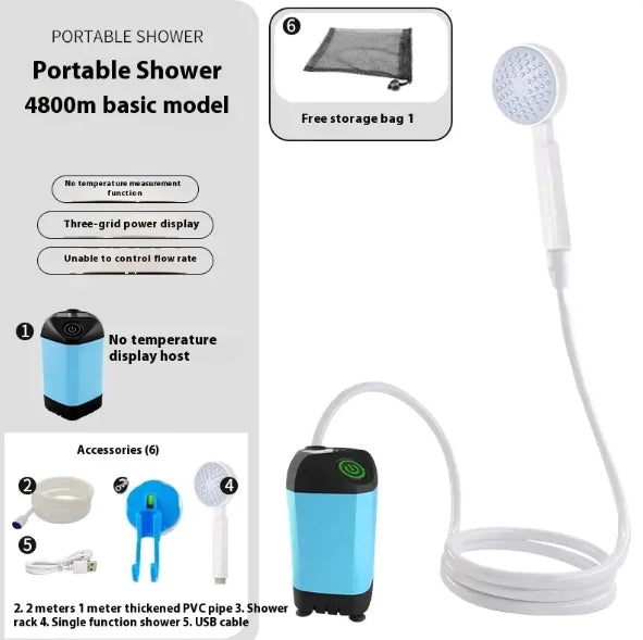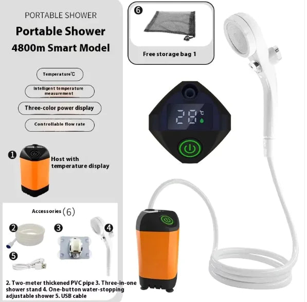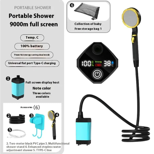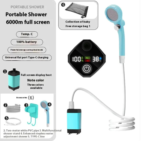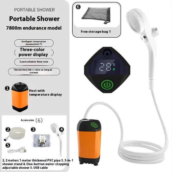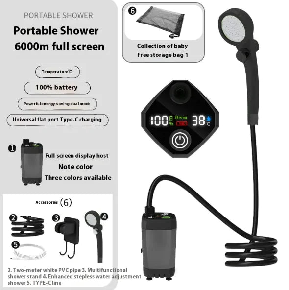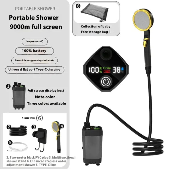 Versatile portable electric outdoor shower, perfect for camping, construction sites, dorms, and home use. Comes with ABS plastic body, modern design, spray and rain functions, and multiple specifications with or without digital temperature displays. Includes main unit, PVC pipe, shower head, holder, and cable. Various options support different battery sizes and feature digital display or adjustable modes for enhanced usability.