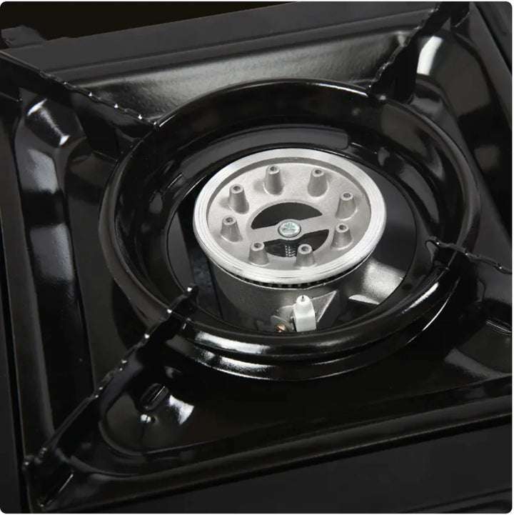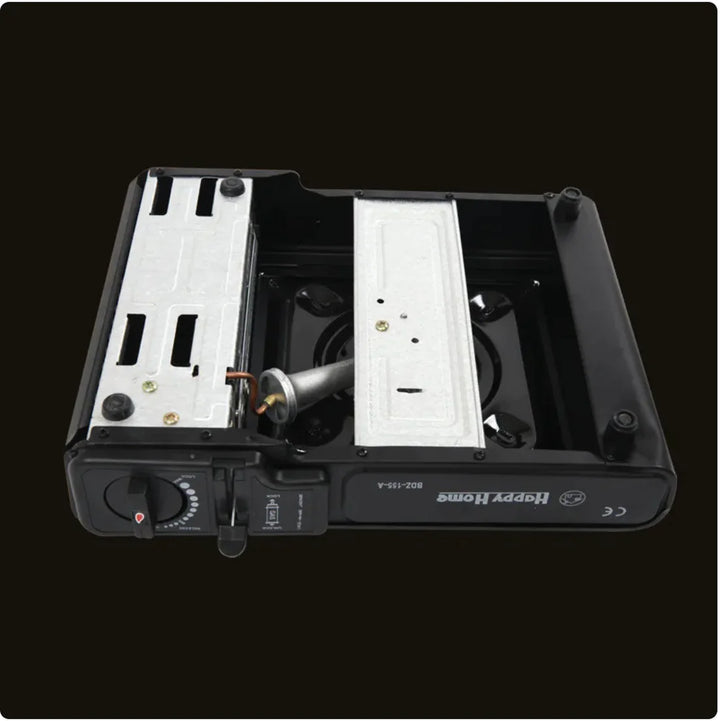 This portable outdoor gas stove is compact, windproof, and perfect for camping, barbecues, and outdoor cooking. It features electronic piezo ignition, adjustable flame control, and a safety pressure-sensing valve. Made of durable metal, it runs on butane gas canisters with an air consumption of about 140g/h. Comes with a handy carrying case for easy transport.
