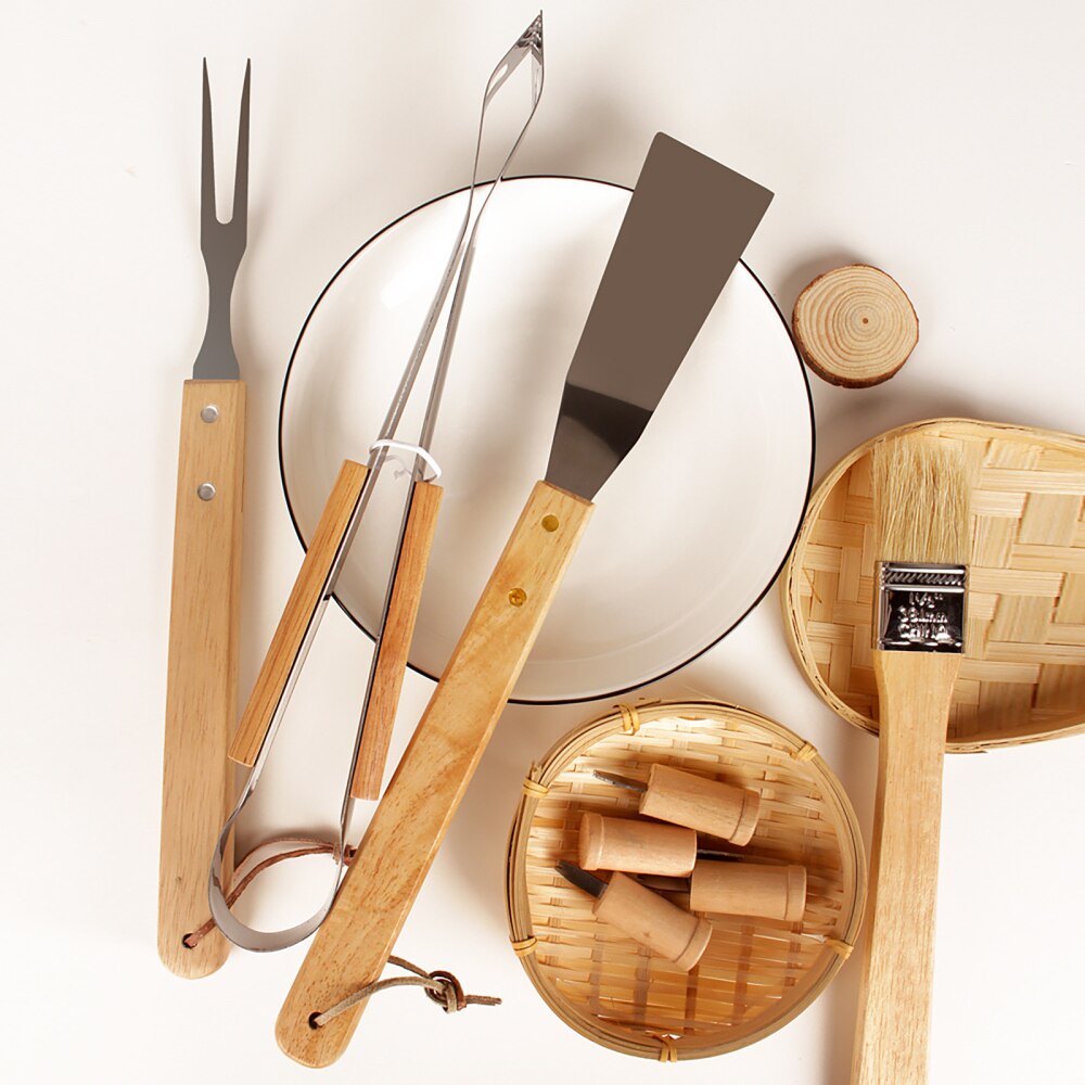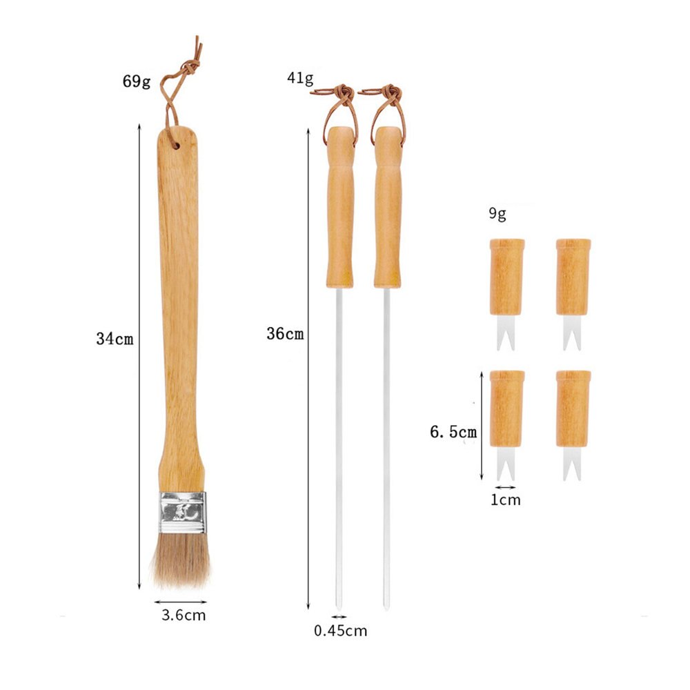This modern minimalist set includes essential grilling tools: a spatula, grill fork, tongs, brush, kebab skewers, and corn forks, all crafted from high-quality stainless steel for durability and easy cleaning. The ergonomic wooden handles ensure a safe and comfortable grip, allowing you to focus on perfecting your grilling skills without the worry of burns.