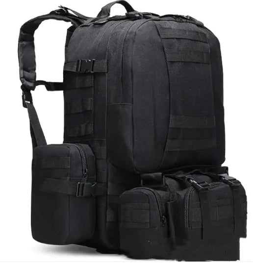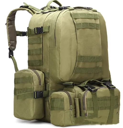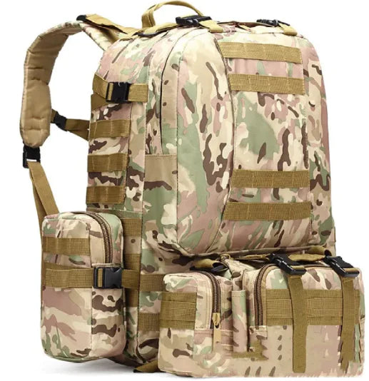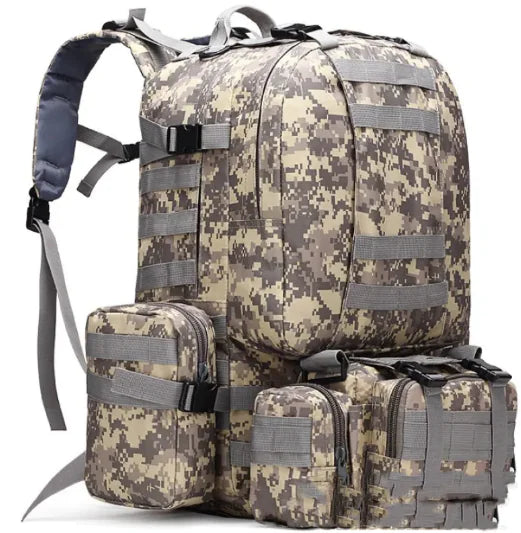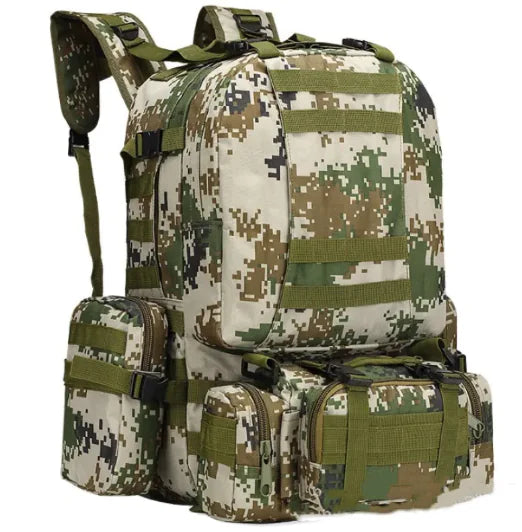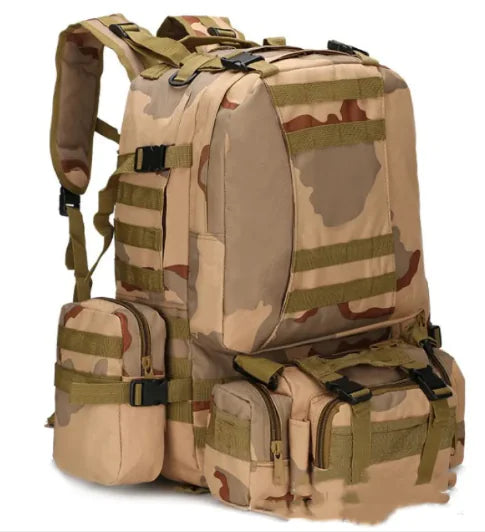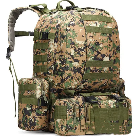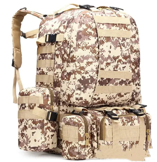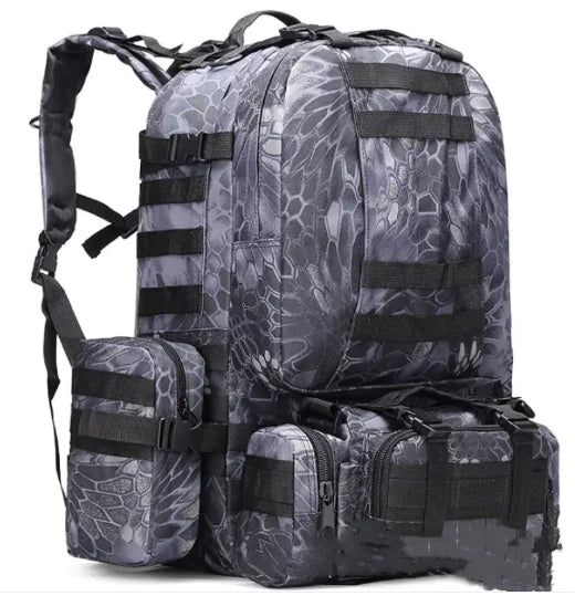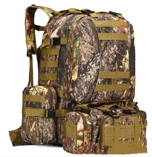 Durable oxford cloth backpack with 56-75L capacity, ideal for camping, hiking, and travel. Available in multiple camouflage and solid colors. Features spacious compartments and rugged construction for outdoor adventures.