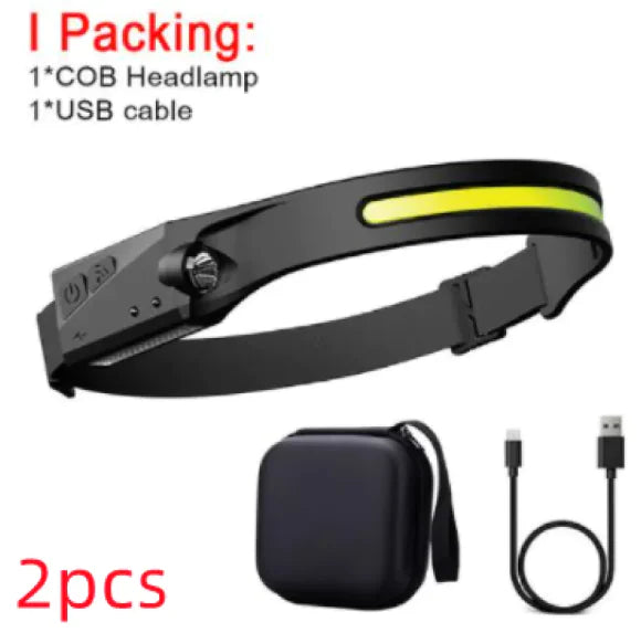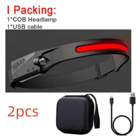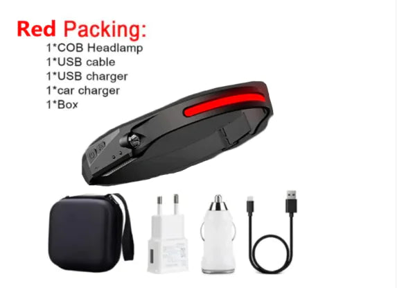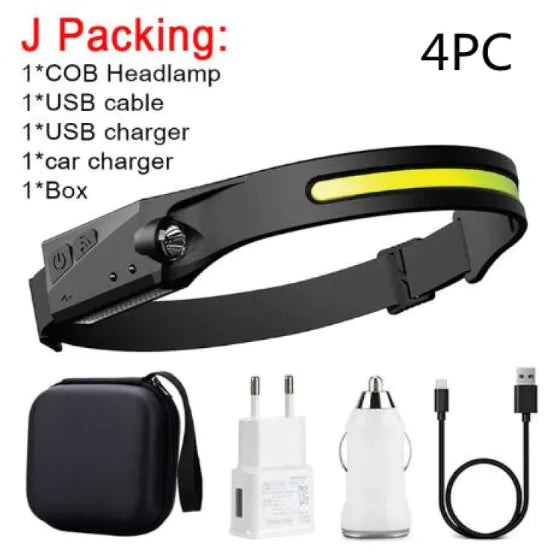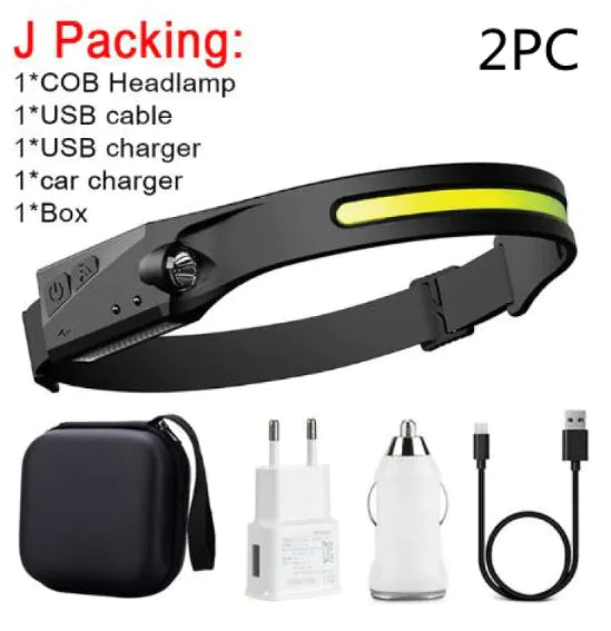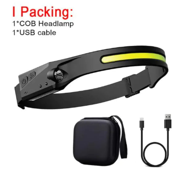 This COB LED induction headlamp offers powerful, hands-free lighting for outdoor activities like camping, hunting, or riding. Featuring a USB rechargeable battery, waterproof design, and all-perspective adjustable beam, it ensures reliable lighting in any environment.