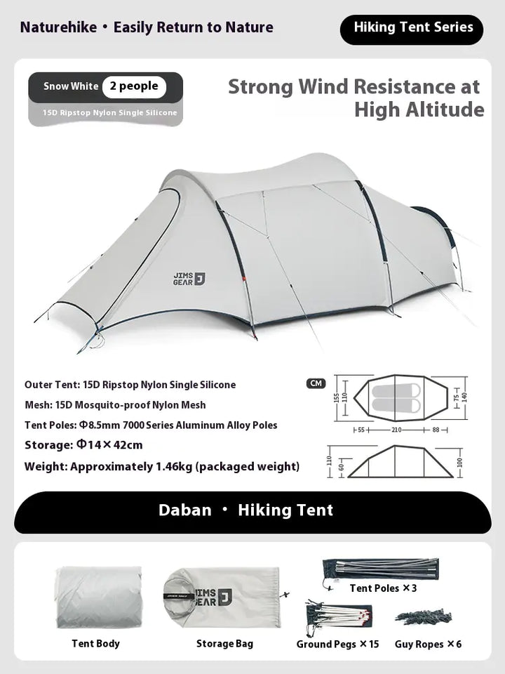 Ultralight 2-Person Tunnel Tent – Trekker’s Dual Shelter | Silicone-Coated Nylon, Aluminum Alloy Frame, Snowland White
